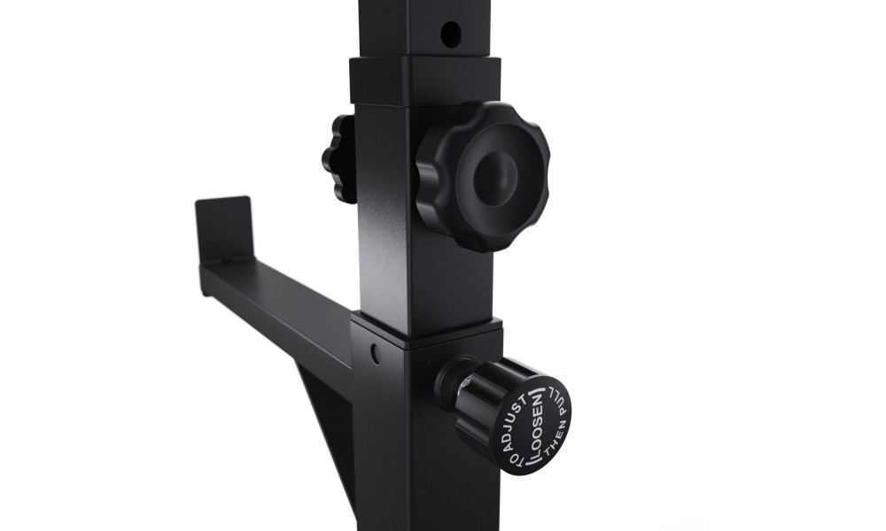 Высота держателей под штангу легко регулируется без дополнительных инструментов. Держатели под штангу регулируются по высоте в диапазоне от 47,5 до 72,5 см нижний и от 99 до 169 см верхний уровень. 15 уровней на верхних ручках и 6 уровней на нижних с шагом 4 см.